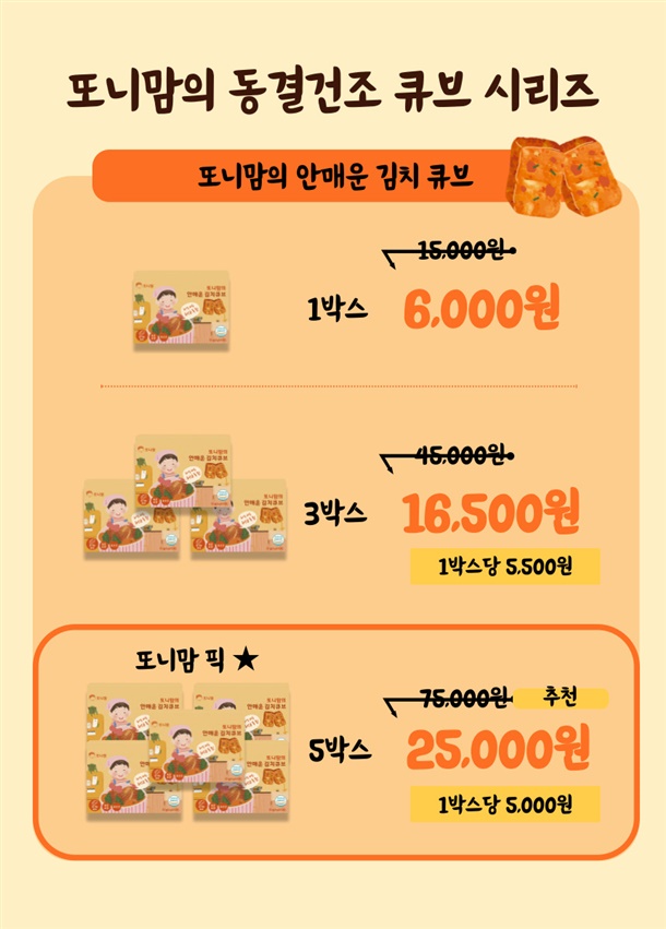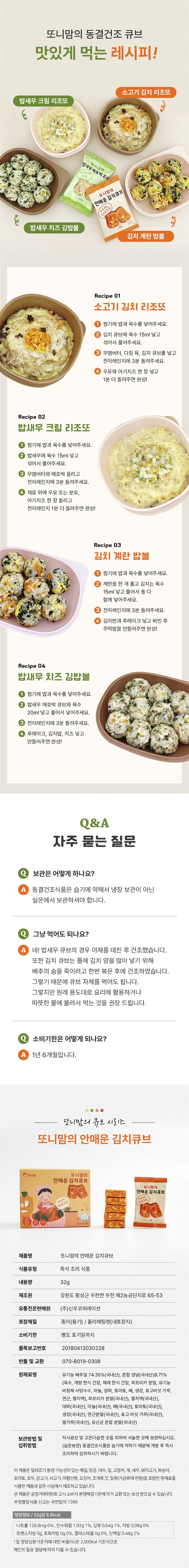 포장단위별 내용물의 용량(중량), 수량 | 또니맘의 안매운 김치큐브(8개입x4g) / 또니맘의 밥새우애호박 큐브(8개입x4.5g) |